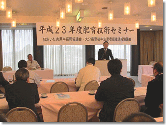 去る12月8日に別府市の「ホテル白菊」で豊後牛肥育組織連絡協議会(会長 尾道一太)及びおおいた肉用牛振興協議会が共催で肥育技術セミナーを開催しました。当日は肥育農家や関係機関の畜産担当者等約40名の参加がありました。午前中は、福岡県肉用牛生産者の会及び博多和牛販売促進協議会会長の三宅貞行さんを講師として招き、「博多和牛の取り組み」について講演を頂きました。福岡県の肥育農家のリーダーとして生産者組織を立ち上げるとともに、「博多和牛」の統一ブランドで福岡県内を中心に積極的に販売促進のためのPR活動や輸出にも取り組んでおり、「豊後牛」のブランド化の取り組みにとって大いに参考になる内容でした。