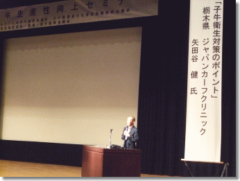 8月11日に九重町「九重文化センターホール」において肉用牛生産性向上セミナーを開催しました。肉用牛経営の改善を図るためには、子牛の商品性向上に向けた飼養管理技術が必要なことから、今回は子牛の発育向上のポイントである衛生対策に特化したセミナーで県内畜産農家等約150名が参集しました。最初に県内での子牛疾病の現状と改善事例について大分家畜保健衛生所 壁村主任より事例発表の報告があり、次に栃木県のジャパンカーフクリニックの矢田谷健氏から「子牛衛生対策のポイント」の題目で講演してもらいました。