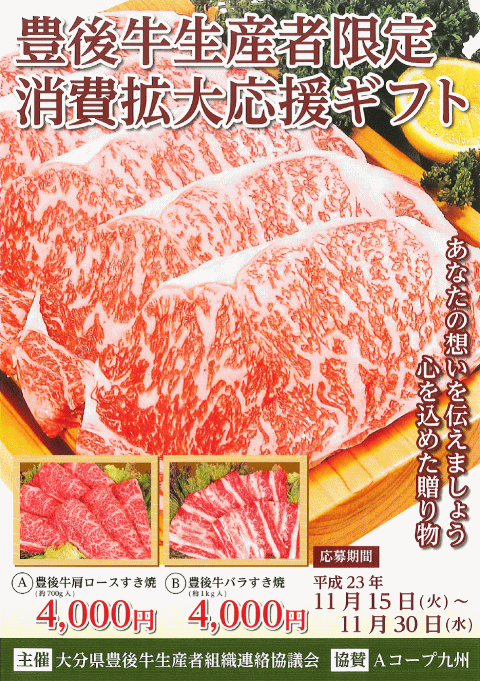 こうした中、大分県豊後牛生産者連絡協議会では豊後牛の消費を喚起する取り組みとして、生産者自ら消費拡大運動に取り組むため「豊後牛肉消費拡大応援ギフト」を実施することにしました。